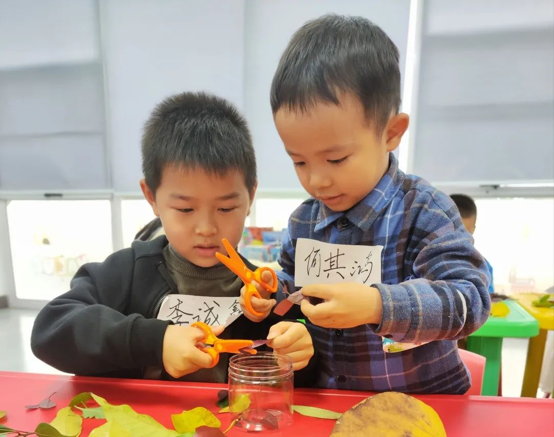 课堂上小朋友们通过看、听、摸、闻等,了解了藏在树叶、动物中的科学奥秘,动手完成了叶绿素提取、艾草包制作等小实验。