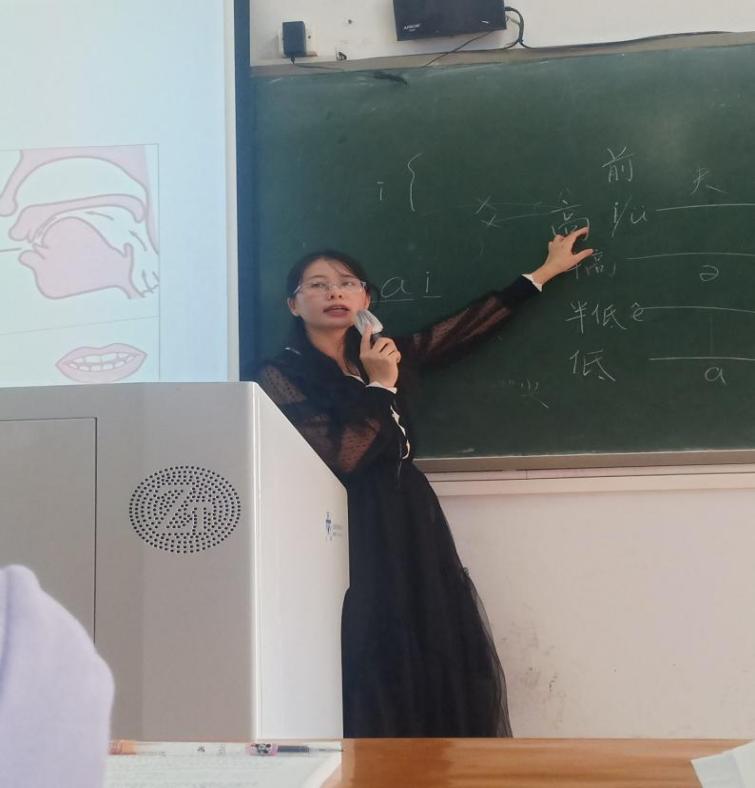 余秋雨曾在《千年一叹》中说过:“一切语言,发音使人理解,语调给人亲切。”语言是文化,语音是语言的物质载体,而学习元音与韵母则是学好语言的一个必要前提。孙咏芳结束了复习后,紧接着通过对比最常见的两个元音来引入知识点。孙咏芳老师在黑板上一笔一画地勾勒出舌面元音舌位唇形图,亲自为同学们展示了单元音的发音方式。舌位唇形图的生动展示让同学们更好地理解舌面元音的三个知识点,即舌位的高低、舌位的前后,以及唇形的圆展。