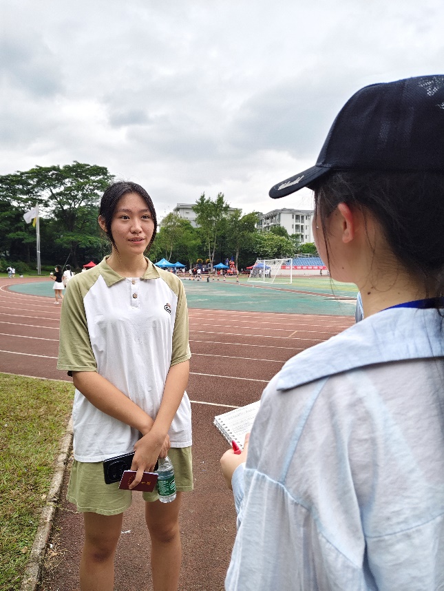 比赛结束后,黄俣祺、陈语欣两位同学接受了记者的采访。在采访中,两人都提及比赛前自己难以抑制的紧张激动的心情,而在比赛时,两位选手都能将紧张化为动力,全力以赴冲向终点,这充分体现了参赛运动员们超越自我,冲刺极限的宝贵精神。正是这样的精神,支撑着运动员们顺利完成比赛。