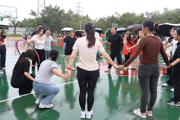 随着裁判一声令下,比赛开始,诸位老师迅速进入状态,有条不紊地传递着呼啦圈。时间一分一秒地流逝,比赛也进行到白热化阶段,我院教职工队伍加快速度,同心戮力,发扬团结精神,迅速又利落地传递着呼啦圈。在呼啦圈顺利地被传回最后一名参赛选手手中后,比赛宣告结束,现场爆发出热烈的欢呼与喝彩声。我院老师们激动地鼓掌、拥抱,尽管雨仍未停下,但每位老师脸上都洋溢着喜悦的笑容。