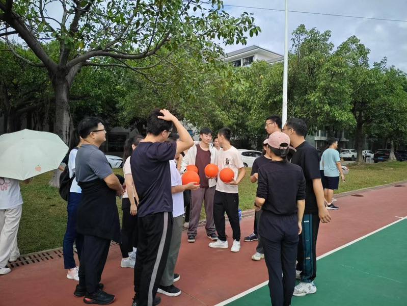 工会主席李明杰老师召集大家练习,两人一组,从开始背靠背到夹球快速行进,默契不断提升。老师们双手握球,从篮球场的一面走到另一面,接力下一组。在练习过程中,赵丽萍老师也积极为练习中的队友加油打气。