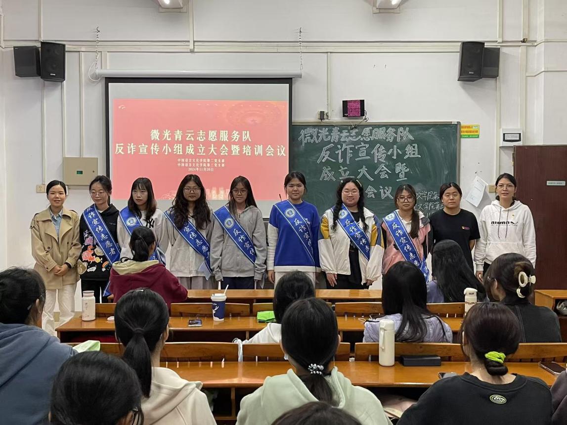为深入贯彻国家关于防范电信网络诈骗的重要指示精神,积极响应校园安全建设的号召,提升大学生群体的防骗意识与能力,中国语言文化学院微光青云志愿服务队于11月25日下午5点在B102举行反诈宣传小组的成立大会暨培训会议,通过组建反诈宣传队伍,共同构筑起一道坚实的校园安全防护网。