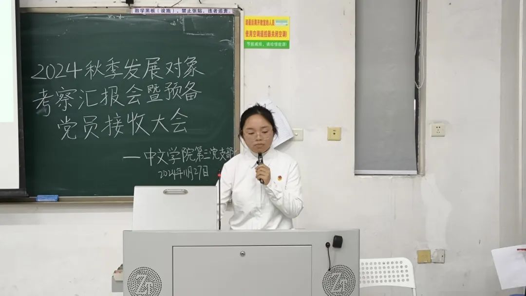 本网讯 为深入贯彻中国语言文化学院党委关于党员发展工作的重要指示,持续推进党员队伍建设,充分发挥党组织的战斗堡垒作用,中国语言文化学院第三党支部于2024年11月27日在F108成功召开2024年秋季发展对象考察汇报会暨预备党员接收大会。中国语言文化学院党总支书记冯钿同志、第三党支部书记杨若颉同志,以及党支部成员黄泳茵老师、王玥老师出席本次会议。会议应到正式党员43人,实到正式党员43人,超过总人数的三分之二,符合开会规定人数。