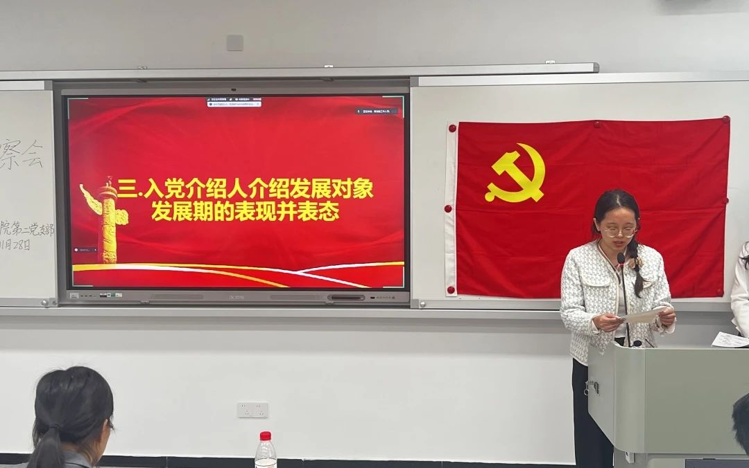 梁秋燕书记介绍发展对象发展期的教育和考察情况,并表示此三十位发展对象自觉遵守校纪校规和党的纪律,认真学习贯彻习近平新时代中国特色社会主义思想,顺利通过入党积极分子以及发展对象党课,各方面表现优良,符合成为中国共产党党员的基本条件。
