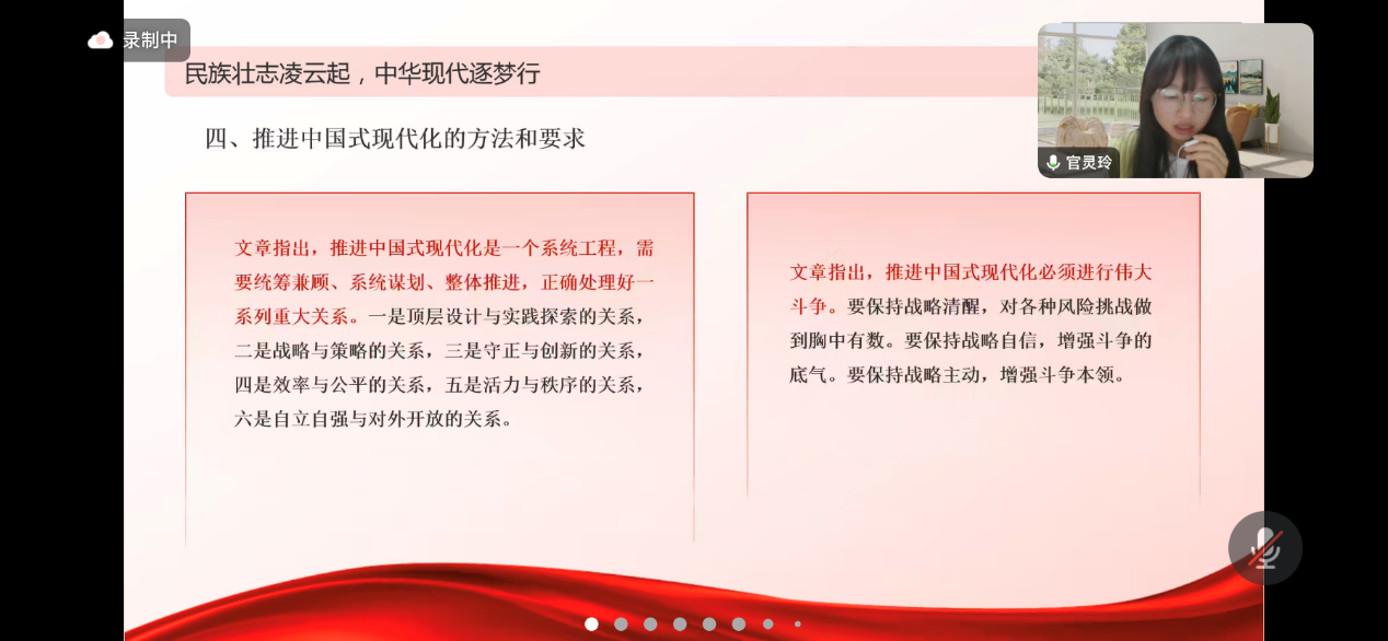 活动伊始,官灵玲同志带领同志们进行了第一议题的学习。第一议题学习了2025年1月1日出版的第1期《求是》的重要文章《以中国式现代化全面推进强国建设、民族复兴伟业》。该文章强调,推进中国式现代化是一个长期任务,要进一步加强理论研究和实践探索,使我们的认识、政策、举措更加符合客观规律,从而逐步进入中国式现代化建设的“自由王国”。习近平总书记的这篇文章如明灯照亮前路,让同志们深刻感悟到中国式现代化的伟大意义和深远影响。它不仅是强国复兴的必由之路,更是中国对世界现代化理论和实践的重大贡献,激励着同志们坚定信心,奋勇向前。